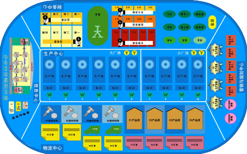 ERP模拟沙盘主要包括:6张沙盘盘面,代表六个相互竞争的模拟企业。模拟沙盘按照制造企业的职能部门划分了职能中心,包括营销与规划中心、生产中心、物流中心和财务中心。各职能中心涵盖了企业运营的所有关键环节:战略规划、资金筹集、市场营销、产品研发、生产组织、物资采购、设备投资与改造、财务核算与管理等几个部分为设计主线,把企业运营所处的内外环境抽象为一系列的规则,由受训者组成六个相互竞争的模拟企业,模拟企业5—6年的经营,通过学生参与-->沙盘载体-->模拟经营 -->对抗演练—> 讲师评析 --> 学生感悟等一系列的实验环节,其融和理论与实践一体、集角色扮演与岗位体验于一身的设计思想,使受训者在分析市场、制定战略、营销策划、组织生产、财务管理等一系列活动中,参悟科学的管理规律,培养团队精神,全面提升管理能力。同时也对企业资源的管理过程有一个实际的体验。
