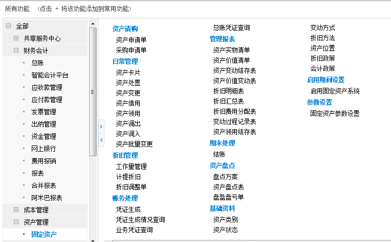 总账、出纳、应收管理、应付管理、固定资产、报表、合并报表、费用报销、智能会计平台