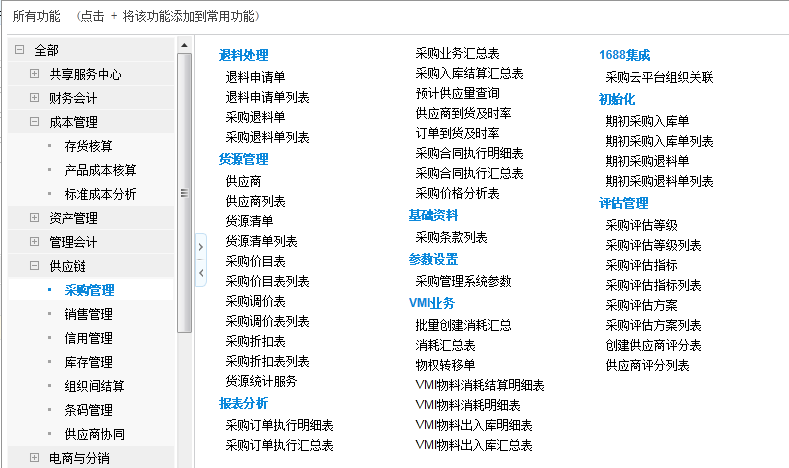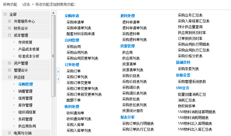 采购管理、销售管理、发票管理、库存管理、信用管理、组织间结算、存货核算、产品成本核算