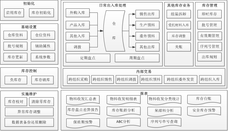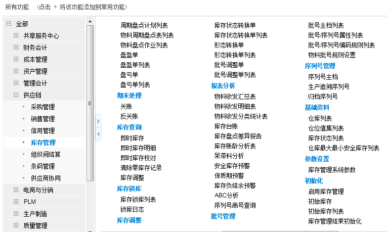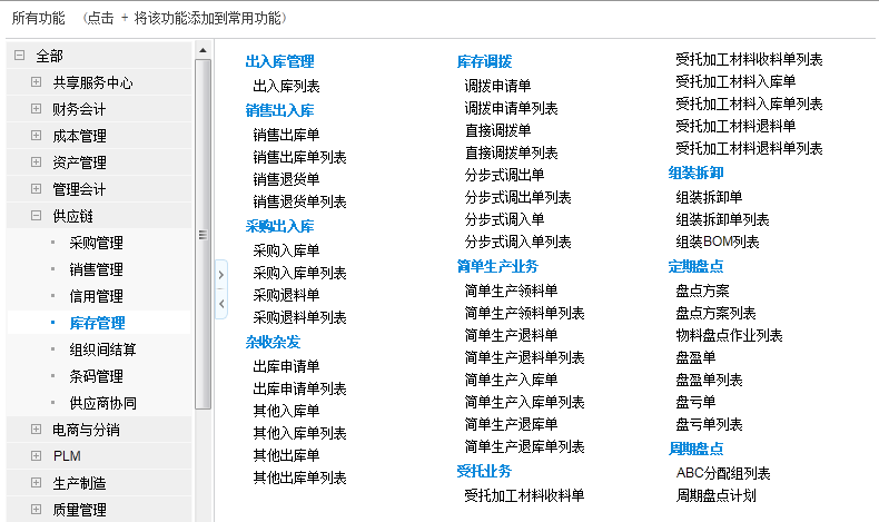 采购管理、销售管理、发票管理、库存管理、信用管理、组织间结算、存货核算、产品成本核算