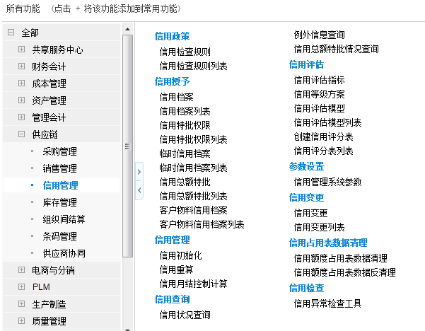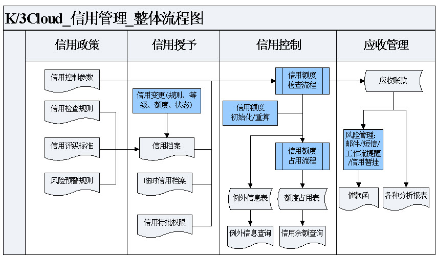 信用管理系统,是通过信用检查规则、信用档案、信用特批权限、信用初始化、信用重算、信用状况查询、例外信息查询、业务单据中的信用查询以及信用评估、信用控制等功能的综合运用,对信用管理全过程进行有效控制和跟踪,从而建立完善的信用管理体系。
