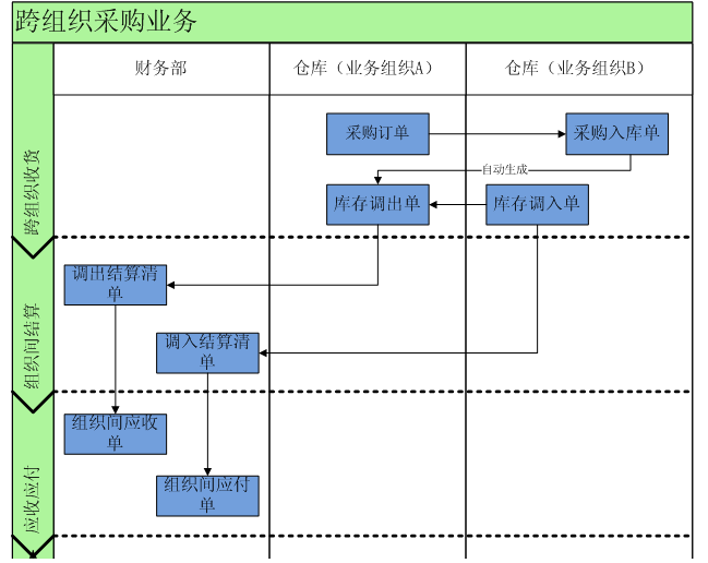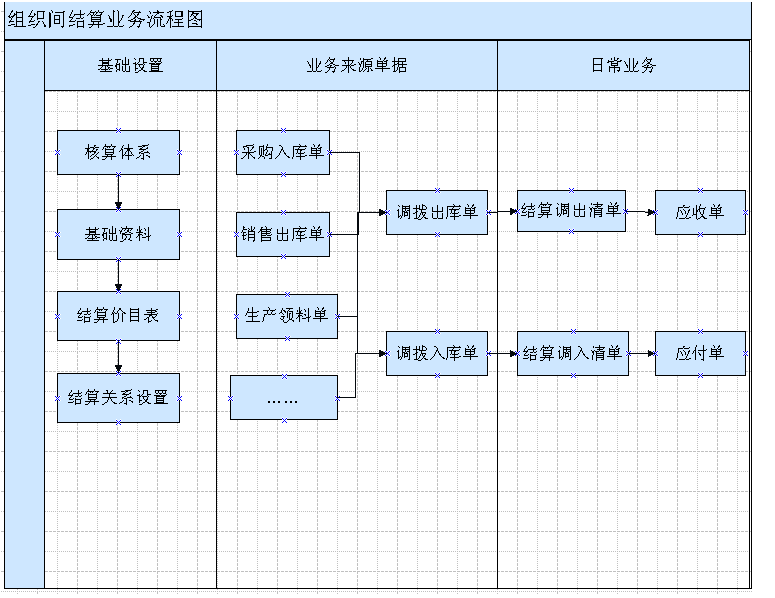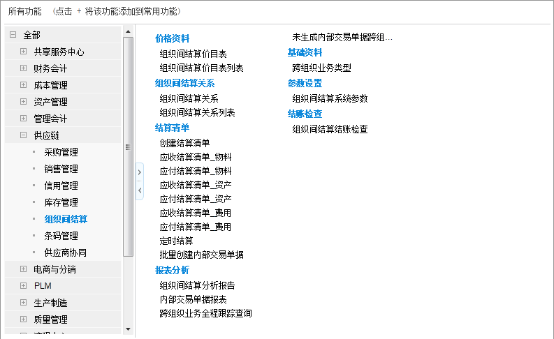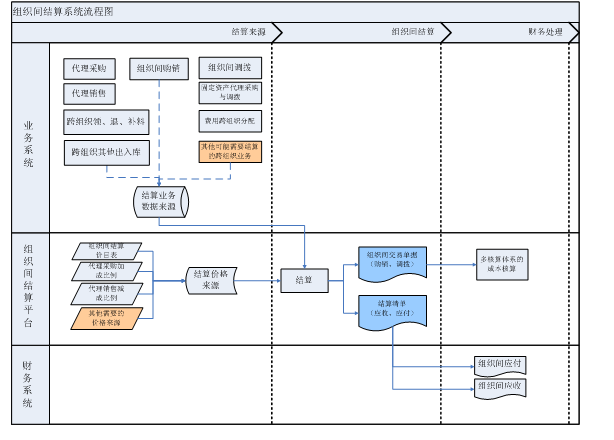 组织间结算根据日常跨组织采购单据、跨组织销售单据、跨组织调拨单据生成结算清单,并关联应收应付,完成组织间内部结算。