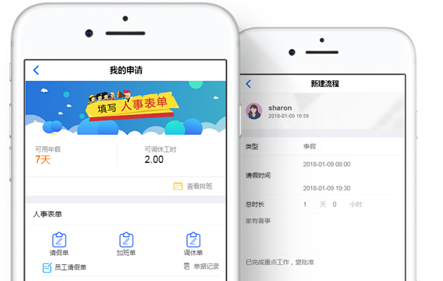 支持对漏打卡情況进行手工签到,对请假/加班/调休的考勤业务进行审